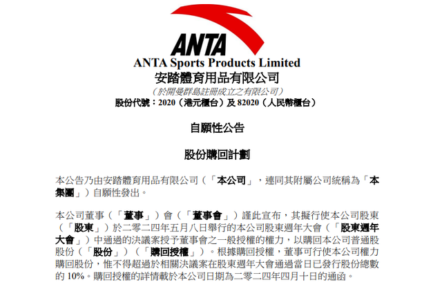 8月27日,安踏体育发布自愿性公告,宣布启动股份回购计划。据披露,安踏体育董事会在2024年5月8日的股东周年大会上获得一般授权,允许其回购不超过已发行股份总数的10%。
